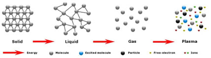 The addition of energy into matter modifies electromagnetic forces, binding atoms together. The state of matter evolves from solid to liquid, then from liquid to gas. Adding even more energy dissociates molecular bonds and may lead to ionization. Gas molecules are split into charged particles, ions and free electrons.